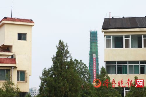 7月25日上午,记者在开元锅炉房看到,在绿色防护网内,烟囱拆除工作正有序进行,施工人员在60米的高脚手架上紧张忙碌着。