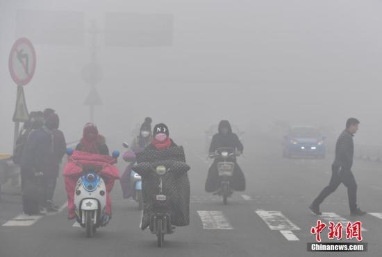 资料图:河北石家庄民众“霾头”出行。 中新社记者 翟羽佳 摄