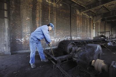 昨日,石景山区首钢重型机器分公司,最后一批煤被送进供暖锅炉,刘师傅在清理入口处的煤块。本版摄影/新京报记者 浦峰
